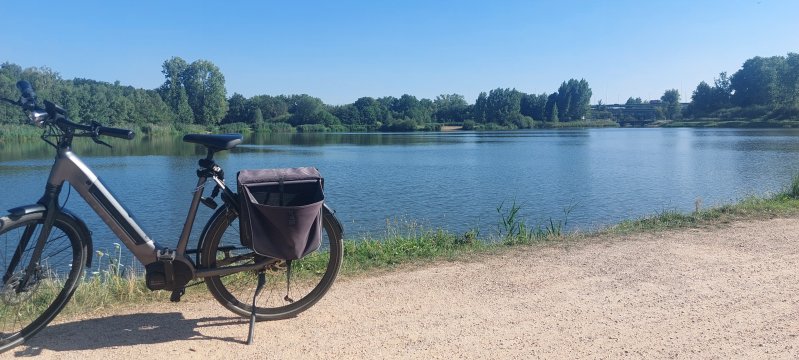 Grijze ebike dames jaar 2021, merk Gazelle Ultimate C380 met fietstas grijs en sticker op achterkant Hartman Bennekom.