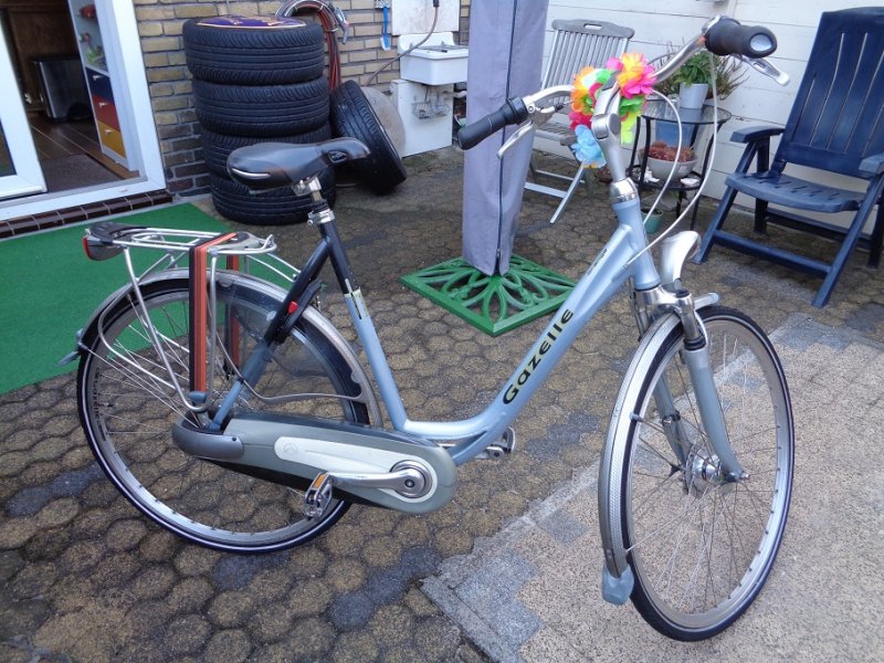 Huidige snelbinders zijn bruin/zwart, heeft een andere voorlamp, de fiets draagt geen mooie slinger, wel een metalen bel met paars/wit dessin. Er zit een stuk grijze tape over scheur achterzijde kettingkast bij de achteras en een gat in de jasdrager achterwiel bij slot. De fiets stond op slot met een AXA-ringslot, een klein kettingslot met paarse plastic behuizing aan het achterwiel en een zwart half uitgerold kabelslot met plastic behuizing om het voorwiel/stuur.