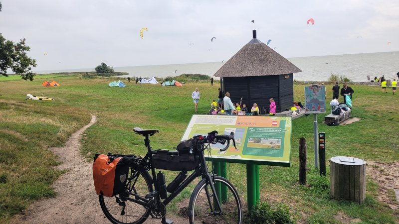 Gravelbike frame waar TREK op staat in witte letters. Bagage rekje achterop. Continental 4 seasons banden. Trappers met binnenband eromheen gewikkeld. Ovalen kettingbladen van Rotor Q rings. Ligstuur voorop. Fietsbel met kompas er op. Tasje bovenop frame met powerbank en telefoon regenhoes. Tas onder framebuis met pomp en reparatiesetje. 2 zwarte bidons met paarse sticker met mijn gegevens. Leren Brooks zadel. Achterlamp van Lezyne. Magnetisch knipperlicht voor en achter. Een aantal spaken aan de onderkant framebuis getaped.