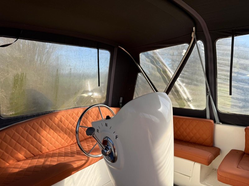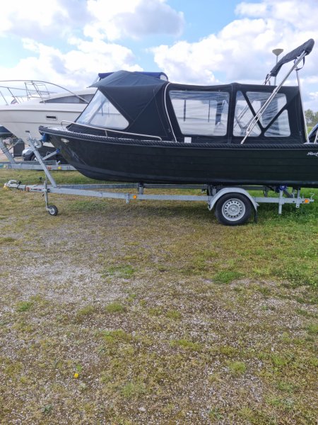 Riomar boot 515 op trailer met 15PS buitenboordmotor. Zwarte romp met zwarte kabelvinnen. Dek en interieur wit met opvallende roodbruine kussens.