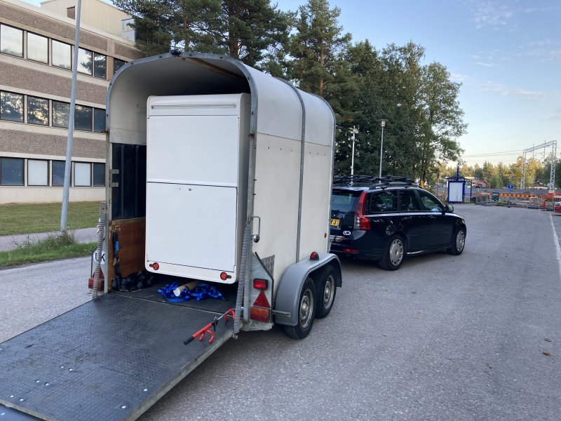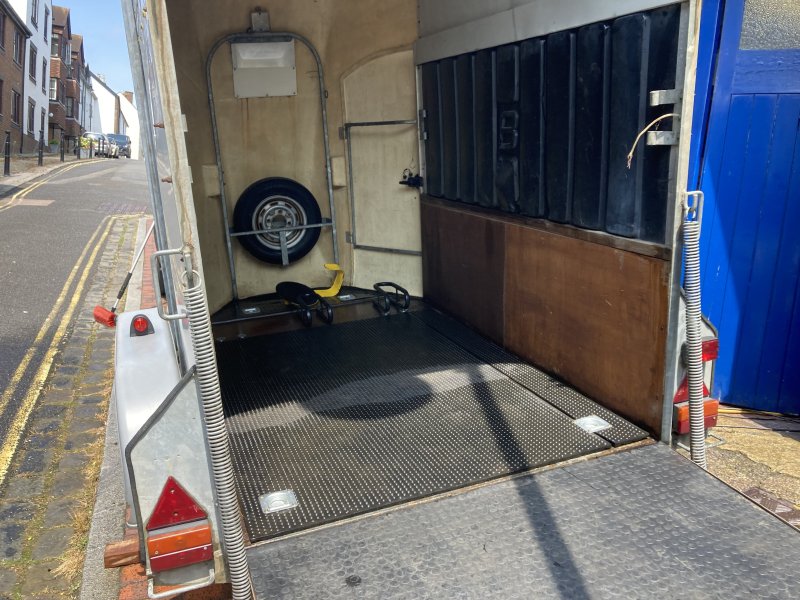 A white Bateson Derby 44 Horse trailer - registered in the UK, Distinctive features are the steel chequerplate repair panel on the rear right-hand side of the trailer, as well as a scratch on the roof on the left hand side stolen from Boschdijk, Eindhoven on 12-01-2026 The trailer has an electric 4-wheel cargo cycle in the back - the brand is EAV