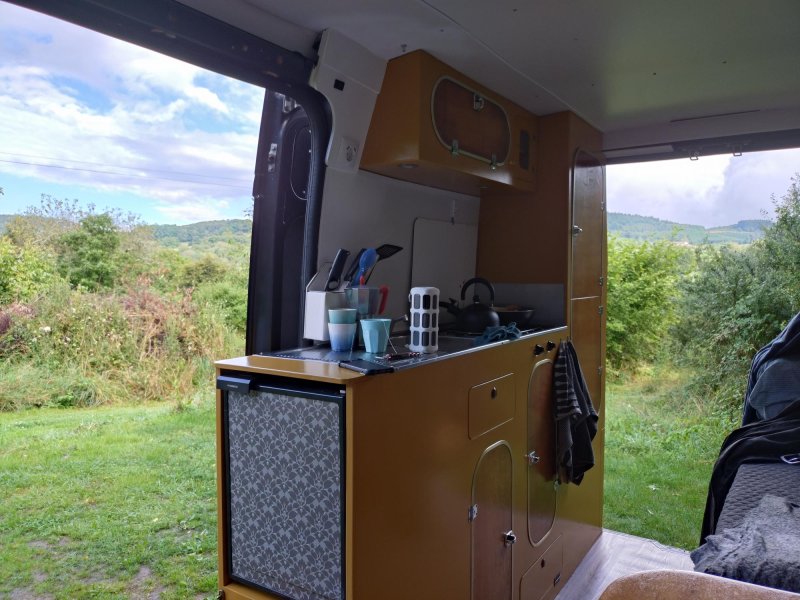 Zwarte Peugeot Boxer, L2H2 met zonnepaneel, dakluik, getinte ruit in schuifdeur, deukje boven rechter achterportier, camperraam met hor en (defecte) verduistering aan de bestuurderskant, opvallend (wit) logo (van leeuwekop met vogeltje erop) daarnaast en 'respect for bikers' sticker aan de achterzijde. Voorstoelen deels met hoezen bekleed, zitting bijrijder niet, oorspronkelijke bekleding daarvan is rood met grijs en van bestuurdersstoel blauw met grijs.