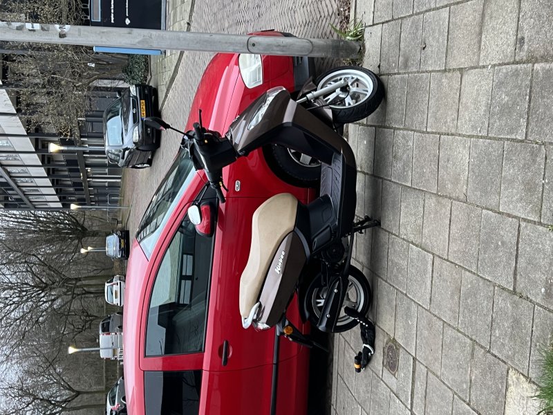 De snorfiets is bruin met een beige leren zadel. Een van de remhendels is aan het uiteinde afgebroken. Er zat een roze helm in. Het was afgesloten met het ART 4 kettingslot. Blauwe kenteken.